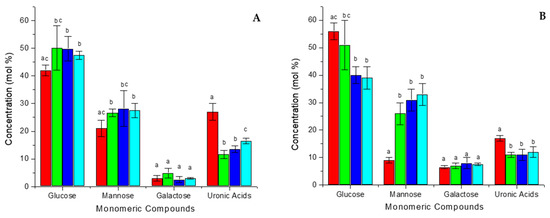 Monosaccharide composition of polysaccharides isolated from the different Aloe vera gel samples: ILF (red), DAG60 (green), DAG80 (blue), DAG100 (cyan) (A). AILF (red), AAG60 (green), AAG80 (blue), AAG100 (cyan) (B). Error bars indicate SD. Significant differences for different samples for each compound are indicated by different letters. (The exact values can be found in Table S2 of the Supplementary Materials).