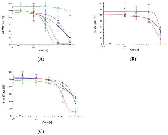 Finally, for quantitative analysis, 800 µL WST-1 containing growth medium was centrifuged (1 min, 8000× g) to precipitate possible cell debris before measuring the absorbance at λ = 440 nm and λ = 690 nm (as background) (Mecasys Optizen-Pop, Daejeon, South Korea). The absorbance of the growth control was normalized to 100%, all other values are expressed relative to this (relative WST-activity).