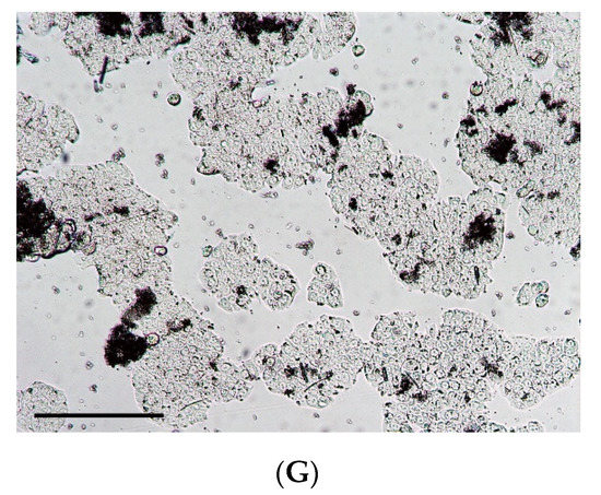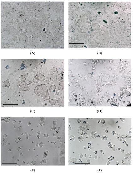 In addition to the metabolic activity (WST test), the cytotoxicity was confirmed by trypan blue staining. The Aloe samples treated at 60 °C or 100 °C, which have CC50 > 1×, do not exhibit cytotoxic effects up to a concentration of 1× (Figure 4B). This is in contrast to the samples treated at 80 °C: The dehydrated sample (DAG80) reduced cell growth already at 0.3× (Figure 4C); the corresponding AIR (AAG80) shows a clear cell growth inhibition at 0.9× (Figure 4E), while the pasteurized sample PAG80 only slightly inhibited cell growth at 1×, but morphological changes can be observed (irregular protuberance) (Figure 4D). In general, only few blue-stained cells can be seen because after the incubation with the sample, the medium was withdrawn, the cells were washed with PBS and fresh medium was added for the WST test, which was done in parallel; in this washing step most of the dead (blue stained) cells were washed away. The sample ILF exhibited a stronger cytotoxic effect on HT-29 at 0.3× (Figure 4F), similar to that previously reported on HeLa and Caco-2 [5,22], but the AIRs of ILF (AILF) showed a very low cytotoxicity (Figure 4G).