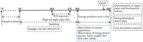 The experiments were comprised of a modeling period and a treatment period as shown in Figure 1. The mice feed with HFHSD was intraperitoneally injected with STZ (50 mg/kg·bw) 4 times (day 28, day 31, day 34 and day 37) to induce T2DM. If the concentration of FBG on day 40 was above 11.1 mmol/L, the mice would be included in the diabetes model [25]. Metformin, kombucha, tea soup and saline were gavage administrated for 28 days according to the various groups of mice. During the experiment, the diet intake, body weight and fasting blood glucose (FBG) were measured every week. At the end of the experiment, samples were collected. The feces were collected and immediately stored at −80 °C. All the mice were fasted for 12 h, and the blood was collected and stored at −80 °C. The liver, pancreas and colon tissues were taken, washed with saline and weighed. Part of the tissues was fixed in 4% paraformaldehyde solution for histopathological experiments. The other part was stored at −80 °C for further analysis.