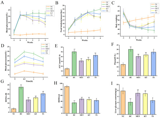 This study evaluated the effect of kombucha on T2DM in mice by monitoring the fasting blood glucose (FBG), food intake and body weight of mice during the experiment. The above values were measured before STZ induction (day 28), after STZ induction (day 37) and during the 4 weeks of administration intervention (day 40, day 47, day 54, Day 61 and day 68). First, the levels of FBG were compared (as shown in Figure 2A). After 28 days of HFHSD feeding, the FBG of mice was about 7.02 mmol/L, which was 1.25 times higher than that of the NC group (5.61 mmol/L, p < 0.05). It indicated that the 28 days HFHSD can increase blood glucose in mice without entering into the state of diabetes. However, after the injection of STZ, the FBG of mice in each group increased significantly to 20–22 mmol/L, which was 4 times higher than that in NC group (p < 0.01). This indicates that the combined induction of HFHSD and STZ leads to the mouse becoming a T2DM model. Subsequently, the food intake and body weight of the mice in each group during the intervention period were compared, as shown in Figure 2B,C. The results showed that, when compared with the NC group, the food intake (11.78 g/mouse/day, p < 0.01) in the T2DM group increased by 2.2 times after STZ intervention while the body weight decreased by 9.65% (44.78 g, p < 0.01). At the same time, there existed a negative correlation between food intake change and body weight change of T2DM mice, with an R value of −0.927 (Figure S1, Table S5. p < 0.01). The above changes in food intake, body weight and FBG are typical characteristics of T2DM [37]. After 4 weeks of KT intervention, compared with DC group, the FBG (15.22 mmol/L, p < 0.01) and food intake (13.59 g/mouse/day, p < 0.01) of mice decreased significantly, and the body weight recovered significantly (48.21 g, p < 0.01). In the TS intervention group, FBG, food intake and body weight were 17.77 mmol/L, 15.2 g/mouse/day and 42.81 g/mouse/day, respectively. The results showed that compared with unfermented tea soup, kombucha tea can more effectively improve the hyperglycemic characteristics of T2DM mice. The polyphenols and organic acid active substances in kombucha may play a role in reducing blood glucose.