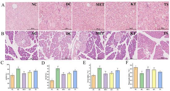 Pancreatic islet injury is one of the mechanisms leading to the pathogenesis of diabetes [39]. It can be seen from Figure 3B that the islets in the DC group were severely damaged. The islet cells were significantly shrunk, as shown by disordered shape, disappearing outline and blurred peripheral boundary. After 4 weeks of intervention, the number of islet cells in the KT group increased and the arrangement became more uniformed, and the boundary between the islet and exocrine part was relatively clear. The results indicated that the kombucha could significantly repair islet injury. In addition, the pancreatic index in the DC group decreased by 29.6% compared with that in the NC group (Figure 4F, p < 0.01). After 4 weeks of intervention, the pancreatic index of the KT and TS groups increased by 1.26 and 1.1 times compared with the DC group (p < 0.01, p > 0.05), respectively. The results indicated that kombucha can also effectively protect the pancreas.