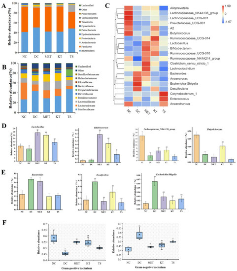 A large number of studies have shown that HFHSD can cause gut microbiota disorder by changing the taxonomic composition of gut microbiota [42,43]. It is therefore important that the regulation effect of the kombucha on the taxonomic composition was investigated. The changes at the phylum level were shown in Figure 4A. Compared with the NC group, the proteobacteria and bacteroides in the DC group increased by 2.2 times and 1.2 times, while Firmicutes decreased by 21.7%. The change in gut microbiota is also a feature of T2DM [1]. Proteobacteria are gram-negative and often believed to include a variety of pathogens, including Salmonella, Vibrio cholerae, Shigella, etc. The increase in Proteobacteria is usually considered as a diagnostic marker for gut ecological disorders and disease risks [44]. The members of Firmicutes are mostly gram-positive bacteria. Firmicutes are usually considered to be anti-inflammatory bacteria because of their production of SCFA metabolites [45]. After 4 weeks of kombucha intervention, Firmicutes increased by 1.26 times and Proteobacteria decreased by 59% compared with the DC group. The taxonomic composition of the gut microbiota in the KT group was altered to resemble the normal group.