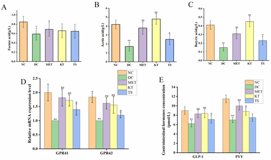 Kombucha regulated the intestinal metabolites in T2DM mice. (A–C) The content of SCFAs (formic acid, acetic acid, butyric acid) in the feces; (D) The mRNA levels of GPR41 and GPR43 in the colon tissue; (E) The levels of GLP-1 and PYY in the serum. * p < 0.05, ** p < 0.01 vs. Normal; # p < 0.05, ## p < 0.01 vs. Model.
