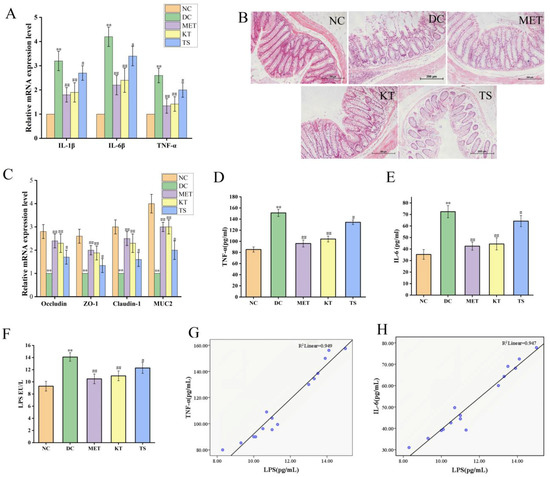 Kombucha improved the intestinal permeability in T2DM mice. (A) Relative gene expression of IL-1β, IL-6 and TNF-α in the colon; (B) Histological examination of colon with H&E staining (scale bars: 200 μm); (C) The mRNA levels of tight junction protein (TJP) Occludin, ZO-1, Claudin-1, and Muc2 in the colon; (D–F) The levels of TFN-α, IL-6 and LPS in the serum. (G,H) Correlation analysis of LPS with IL-6 and TNF-α. ** p < 0.01 vs. Normal; # p < 0.05, ## p < 0.01 vs. Model.