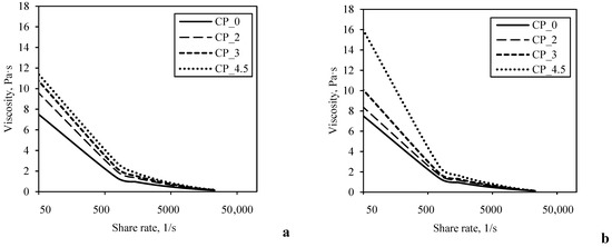 Viscosity curves of yogurt made by adding different amount of CP after (a) and before fermentation (b).