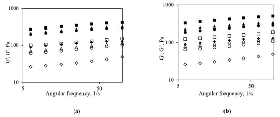 Frequency sweep tests of yogurt made by adding different amounts of CP after (a) and before fermentation (b). ♦, ◊—CP_0; ●, ○—CP_2; ▲, △—CP_3; ■, □—CP_4.5. Filled symbols represent storage modulus (G′), empty symbols represent loss modulus (G″).