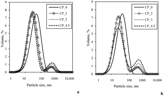 Particle size and distribution of yogurt made by adding different amount of CP after (a) and before fermentation (b).
