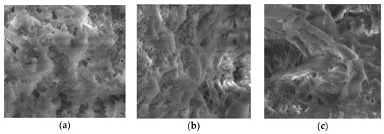 Micrographs of the yogurts also showed the differences in the CP-fortified yogurt structure, particularly for high CP content. A typical casein aggregate-based network with open spaces was recorded for the plain yogurt (Figure 4a). The microstructure of the CP-supplemented yogurt was different from that of plain yogurt and depended on the timing of the CP addition. The yogurt with CP added after fermentation (Figure 4b) consisted of a three-dimensional network of casein aggregates with larger pores and heterogeneously sized channels with the CP fiber located within these void spaces. The yogurt with CP added before fermentation demonstrated two heterogeneously blended networks: a rough appearance representing CP fiber and another more compact protein network, which seemed to be embedded into the first one (Figure 4c).
