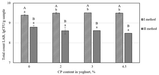 Viability of lactic acid bacteria (LAB) in yogurt made by adding different amounts of CP after (I method) and before fermentation (II method). Values are reported as means ± standard deviation; lower case letters indicate significant (p < 0.05) differences between different CP content in yogurt; upper case letters indicate significant (p < 0.05) differences between different CP addition methods.