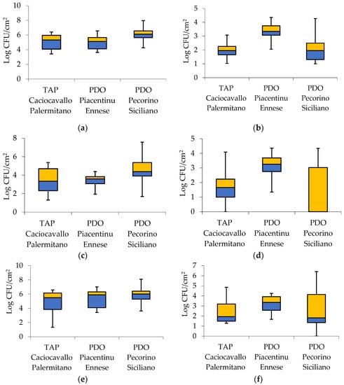 The TMM variability observed for the PDO Pecorino Siciliano wooden shelves was lower than that registered for the boards used for the other two cheeses (Figure 1a). On the contrary, the TMM of the boards used for the Pecorino Siciliano cheese showed the highest levels. The enterococci distribution of PDO Piacentinu Ennese wooden shelves (Figure 1b) showed the highest levels. The distribution of the levels of mesophilic LAB rods (Figure 1c) showed the highest variability in the PDO Pecorino Siciliano wooden shelves. In the case of thermophilic LAB rods (Figure 1d), the distribution was quite wide for the very low levels (below detection limit) revealed on the wooden shelves used to ripen TAP Caciocavallo Palermitano and PDO Pecorino Siciliano cheeses. The mesophilic LAB cocci distribution (Figure 1e) was highly similar among the wooden shelves analyzed. Regarding termophilic LAB cocci (Figure 1f), the widest distribution was observed for the PDO Pecorino Siciliano wooden shelves.