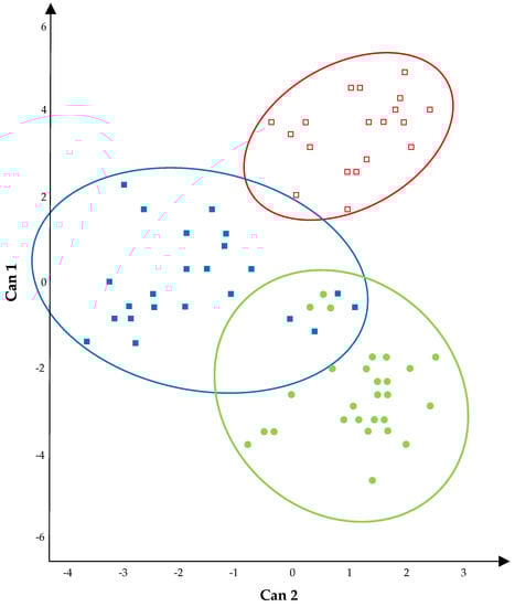 The MD between the three centroids of Figure 2 was statistically significant. The longest distance was registered between the wooden shelves of the PDO Pecorino Siciliano cheese area and those of the PDO Piacentinu Ennese cheese (MD = 29.04; p < 0.001). On the contrary, the shortest distance was measured between the centroid area of PDO Pecorino Siciliano wooden shelves and that of TAP Caciocavallo Palermitano wooden shelves (MD = 13.10; p < 0.001), for which a slight overlap of some points was also observed.