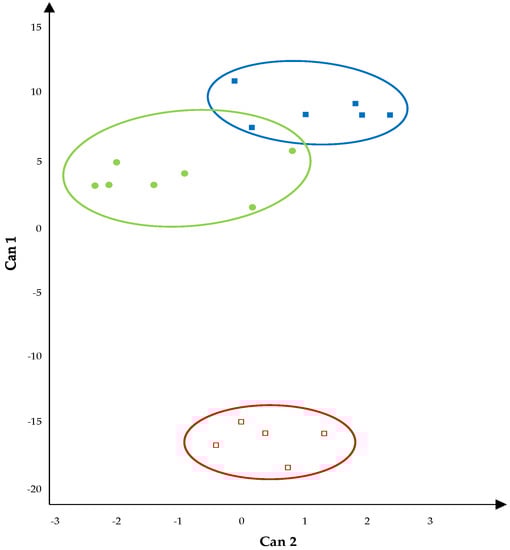 The OTUs’ relative abundances were subjected to the multivariate statistical analysis. Not all of the results of the statistical tests obtained with the CANDISC procedure were significant: the Wilks Lambda and Hotelling−Lawley tests showed a significance for p < 0.05, while the Roy maximum root test was significant for p < 0.01. The canonical 1 x canonical 2 plot (Figure 3) showed a good graphic separation between the three areas, with a clear remark between the wooden shelves used to ripen the PDO Piacentinu Ennese cheeses and those used for the ripening of the other two cheeses.
