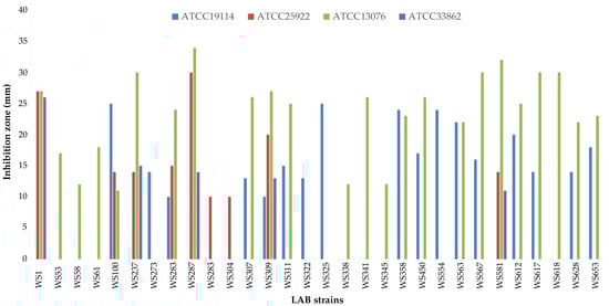 Among the dominant LAB, 75 strains were identified and allotted into the species Enterococcus faecalis, Enterococcus faecium, Enterococcus durans, Enterococcus casseliflavus, Enterococcus gallinarum, Enterococcus italicus, Enterococcus lactis, Enterococcus thailandicus, Enterococcus viikkiensis, Lactococcus lactis, Leuconostoc mesenteroides, Pediococcus acidilactici, Pediococcus pentosaceus, Lactobacillus delbrueckii, Weissella hellenica, and Weissella paramesenteroides [21]. In the present work, all LAB strains were tested for their inhibitory properties against the four main dairy pathogens. Thirty strains were able to inhibit at least one indicator strain (Figure 4).