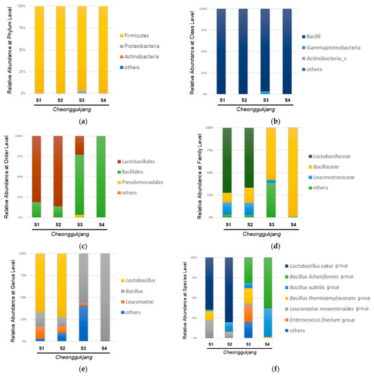 Figure 1. Microbial composition in the cheonggukjang samples (S1–S4): Relative abundance (%) at (a) the phylum level; (b) class level; (c) order level; (d) family level; (e) genus level; (f) species level.