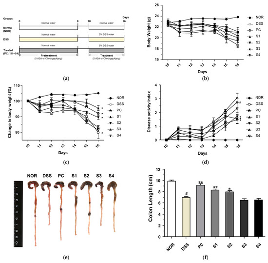 The animals were divided into seven groups (five mice/group) according to the treatment: NOR group (normal control), DSS group [5% DSS (MP Biomedicals, Irvine, CA, USA)], PC group [positive control; 5% DSS + 50 mg/kg/day of 5-aminosalicylic acid (5-ASA; Sigma-Aldrich, St. Louis, MO, USA)], S1 group (5% DSS + 500 mg/kg/day of S1 sample), S2 group (5% DSS + 500 mg/kg/day of S2 sample), S3 group (5% DSS + 500 mg/kg/day of S3 sample), and S4 group (5% DSS + 500 mg/kg/day of S4 sample). The NOR and DSS groups were administered distilled water. Cheonggukjang samples (S1–S4) were orally administered at a dose of 500 mg/kg once a day for 15 days. To induce colitis, mice were administered 5% DSS in drinking water for seven days, and then sacrificed after one day.