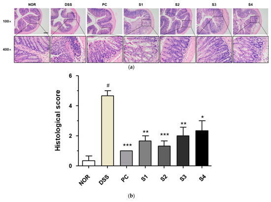 Figure 3. Histological changes in colorectal tissues of DSS-induced colitis mice: (a) Representative H&E images of colon tissue. Scale bar; 100 μm; (b) Histological score. Values are presented as the mean ± SD (n = 5); #, p < 0.005 versus normal group; ***, p < 0.001; **, p < 0.005; *, p < 0.05 versus DSS group.