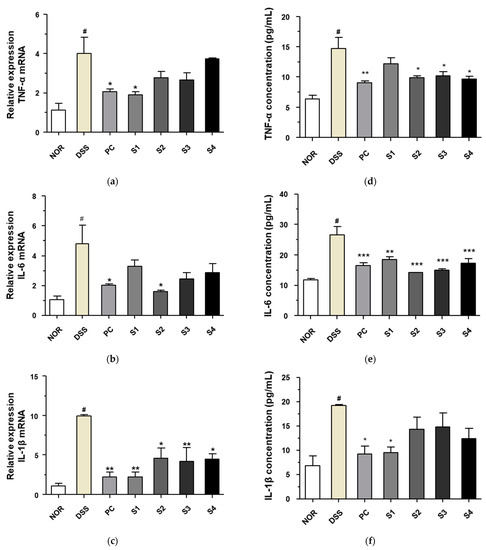 DSS-induced colitis is associated with the induction of proinflammatory cytokines, such as TNF-α, IL-6, and IL-1β [26], and its expression is modulated by probiotics [27]. Thus, we investigated the expression of these markers to evaluate the effect of Cheonggukjang samples (S1–S4) containing probiotics on inflammation in DSS-induced mice. As shown in Figure 4a–c, the DSS group showed increased mRNA levels of TNF-α, IL-6, and IL-1β in colonic tissue. These increased mRNA levels were reduced significantly in the PC- and Cheonggukjang-(S1–S4) treated groups. Next, to confirm these effects, we evaluated the secretion of TNF-α, IL-6, and IL-1β in the blood. The secretion of TNF-α, IL-6, and IL-1β in the blood was increased in the DSS alone group, compared to those in the control group, as shown in Figure 4d–f. This increased secretion was significantly reduced in the PC- and Cheonggukjang (S1–S4)-treated groups, similar to the findings at the mRNA level. These results suggest that Cheonggukjang inhibits the mRNA and protein secretion of proinflammatory cytokines in mice with DSS-induced colitis.