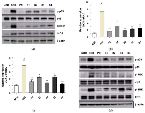 NF-κB and MAPK are important signaling pathways that play a role in inducing the inflammatory response in DSS-induced colitis models [28]. Therefore, we measured the expression of these signaling molecules to evaluate the inhibitory activity of Cheonggukjang against DSS-induced colitis. As shown in Figure 5a, the level of phosphorylated NF-κB p65 was significantly increased in the DSS alone group compared to that in the control group. DSS-induced phosphorylation of NF-κB p65 was significantly decreased upon treatment with PC and Cheonggukjang (S1–S4). Levels of inflammatory enzymes, such as COX-2 and iNOS, are controlled by the proinflammatory transcription factor NF-κB p65 [29]. Thus, we evaluated the protein and mRNA levels of COX-2 and iNOS. The protein levels of COX-2 and iNOS were increased in the DSS alone group compared to those in the control group, similar to the expression of NF-κB p65. DSS-induced protein levels of COX-2 and iNOS decreased significantly upon treatment with PC and Cheonggukjang (S1–S4). We also confirmed the mRNA levels of COX-2 and iNOS after treatment with PC and Cheonggukjang (S1–S4) (Figure 5b,c). Next, we evaluated the effect of Cheonggukjang samples (S1–S4) on the MAPK signaling pathways. As shown in Figure 5d, the levels of phosphorylated p38, JNK, and ERK were significantly increased in the DSS alone group, compared to those in the control group. DSS-induced phosphorylation of p38, JNK, and ERK decreased significantly upon treatment with PC and Cheonggukjang (S1–S4). These results suggest that Cheonggukjang can attenuate DSS-induced colonic inflammation by modulating the NF-κB and MAPK signaling pathways.