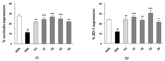 IBD compromises epithelial barrier functions by reducing tight junction proteins, including transmembrane barrier proteins (occludin) and cytoplasmic scaffolding proteins (ZO-1) [32]. Therefore, to examine the effect of Cheonggukjang samples (S1–S4) on intestinal barrier function after DSS treatment, tight junction protein expression was determined by immunohistochemical staining. As shown in Figure 6d,e, the expression levels of occludin and ZO-1 were significantly reduced in DSS-treated mice relative to those in the control group. However, PC and Cheonggukjang (S1–S4) treatment elevated the protein expression of occludin and ZO-1 compared to the DSS alone group. These results suggest that Cheonggukjang may improve intestinal epithelial barrier integrity by modulating mucins and tight junction proteins.