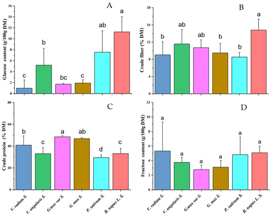 Comparison of fructose, glucose, crude protein, and crude fiber contents between rapeseed sprout and bean sprouts. (A) Glucose content. (B) Crude fiber content. (C) Crude protein content. (D) Fructose content. The different lowercase letters a, b, c, and d represent significant differences in investigated sprouts (p < 0.05).