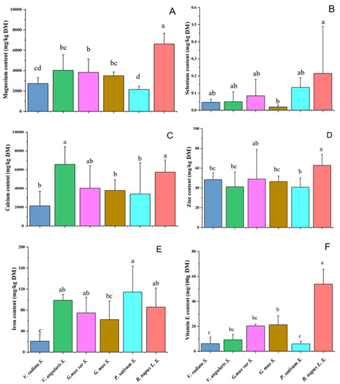 Comparison of five mineral element contents (magnesium, selenium, calcium, zinc, and iron) and Vitamin E content in investigated sprouts. (A) Magnesium content. (B) Selenium content. (C) Calcium content. (D) Zinc content. (E) Iron content. (F) Vitamin E content. The different lowercase letters a, b, c, and d represent significant differences in investigated sprouts (p < 0.05).
