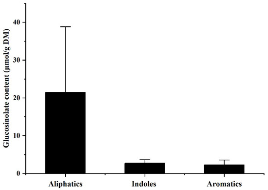 Glucosinolate is a sulfur-containing secondary metabolite found exclusively in the Cruciferae [37]. Some glucosinolates, especially glucoraphanin and glucobrassicin, have remarkable anticancer activity [38]. In terms of the peak area, the glucosinolate content in all the investigated bean sprouts was negligibly low, while its average content in rapeseed sprouts was up to 26.96 umol/g, which was mainly composed of aliphatic glucosinolates (Figure 3). Large variation in glucosinolate content was observed across B. napus L. varieties. These results suggested the advantages of rapeseed sprouts in providing glucosinolates with anti-cancer properties.