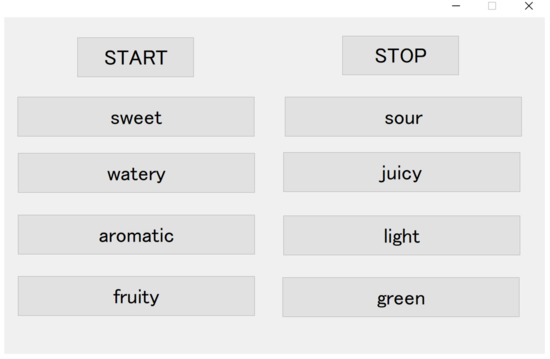 In the main tasks, the participants rinsed their mouths before each trial. They selected a strawberry with their non-dominant hand, keeping their eyes closed and pinching their nose by the dominant hand. Some properties of strawberries including freshness are influenced by their appearances [31]; hence, we shut out the visual cues. Further, their odors could influence the task even before eating; hence, we also shut out the olfactory cues. After they put the whole strawberry into their mouth, they immediately started the evaluation using the graphical user interface with their eyes opened and their hand released from their nose. The panels then selected the button corresponding to the most dominant feeling at each moment, as mentioned in Section 2.1. There was no time limit for the task. Each task lasted approximately 30 s. Each panel performed three trials for each category of sensory attributes. Nine participants performed the task using primary-sensory attributes first, while eight participants performed the task using multi-sensory attributes first. The experiments were conducted at least 1 h after a meal.