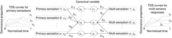 This study linked the TDS results for primary- and multi-sensory attributes using canonical correlation analysis (CCA). This method links two groups of variables using latent variables, which explains the relationships among multiple variables in the two groups. One of the biggest differences between this and earlier studies [17,18] that attempt to link TDS and TDE models is the use of past information in the time-series data. Two earlier models [17,18] were retrospective and modeled the TDS and TDE results at a set time point using past information. In contrast, our model is concurrent and computes the change in an attribute of the TDS task for multi-sensory attributes at a set time point using changes in the attributes of the TDS task for primary-sensory attributes at the same time point. Researchers have discussed which retrospective or concurrent model is most appropriate for analyzing time-series data [25,26]. For example, Chen et al. [25] compared retrospective, concurrent, and unified analysis of neuroimaging data. However, researchers have not yet discussed the possibility of using a concurrent model to link TDS tasks. One of the purposes of this study was to investigate this possibility.