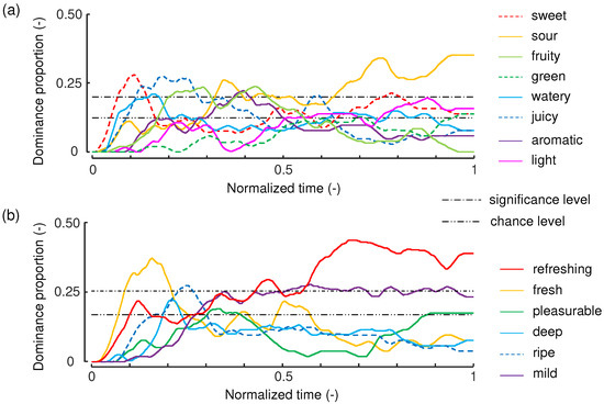 Regarding primary-sensory attributes, sweet, juicy, and watery were dominant at the beginning of the evaluation (0–0.2 normalized time). Attributes related to fragrance, such as fruity and aromatic, became dominant at 0.2–0.3 normalized time. Sourness was prominent from the middle to the second half of each task. Similar curves were observed in the results of the TDS method for strawberries [17]. Regarding the multi-sensory attributes, fresh was dominant at the beginning. Then, ripe and deep became prominent. Refreshing and mild were mostly dominant after approximately 0.3 normalized time. In particular, refreshing was prominent at the end of the task.