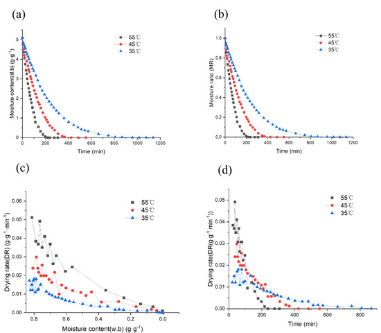 In the present study, the hot air thin layer drying of Mentha haplocalyx leaves were carried out at 35 °C, 45 °C and 55 °C. The initial moisture content (dry basis) of the Mentha haplocalyx leaves was 5.10 ± 0.22 (mean ± SD). The relationship between the moisture content of the dry base of peppermint at a series of time points during the drying process and under the different hot air-drying temperatures are shown in Figure 1a. The optimal moisture content (w.b) level for storage of dried Mentha haplocalyx without risk of spoilage was less than 25% moisture [35]. In Figure 1a, the higher the temperature, the faster the rate of water loss and the shorter the time required for drying is shown. The initial dry base moisture content of peppermint decreased from 5.10 to a constant value of 0. Under this condition, the different drying times used in this study has been determined as 238 min at 55 °C, 424 min at 45 °C, and 1017 min at 35 °C, respectively, as shown in Figure 1a. The drying duration required at 35 °C was 4.27 times longer than that at 55 °C. It was noticed that the drying temperature is the key factor in determining the drying time. The higher drying temperature requires a greater heat power with a massive transportation of air that can shorter the drying duration [36]. Moreover, the relationship between the moisture ratio (MR) and drying time curves of peppermint at different drying temperatures in Figure 1b shows that the higher the temperature, the shorter time required for the drying process, while the MR values of peppermint leaves are the same during the drying process. As observed in Figure 1b, the changes of MR as well as the drying rate were found to agree with the finding of the previous study at the different drying temperatures [23]. These results suggested that the effect of air temperature is reflected with the drying rate for preparing dried Mentha haplocalyx leaves.