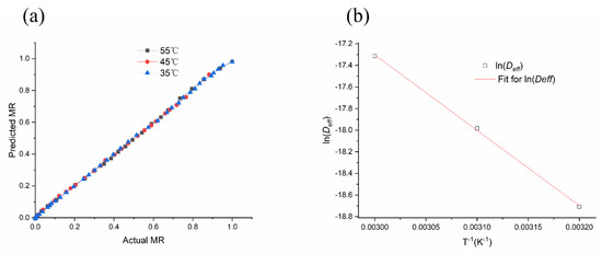 (a) The predicted MR by the Midilli model vs Actual MR, (b) Arrhenius type relationship between effective diffusivity and temperature.