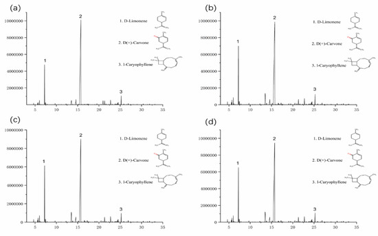 Total ion chromatogram of volatile oil component GC-MS before and after drying of Mentha haplocalyx. (a) Fresh Mentha haplocalyx volatile oil, (b) Mentha haplocalyx volatile oil after drying at 35 °C, (c) Mentha haplocalyx volatile oil after drying at 45 °C, (d) Mentha haplocalyx volatile oil after drying at 55 °C.