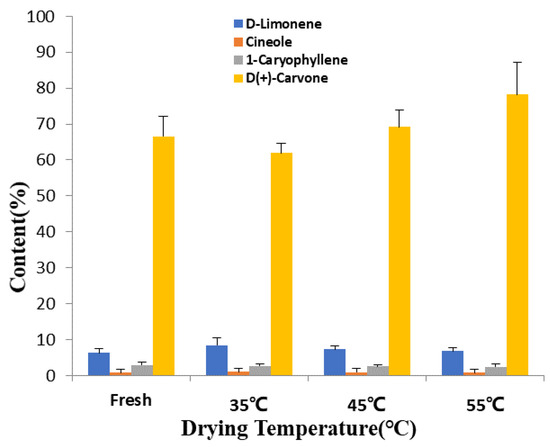 The chromatographic separation conditions were obtained by systematically optimizing the temperature increase program. As shown in Figure 4, the separation of the bioactive components was measured and the peak shape was distributed well. The peaks were subjected to mass spectrometry to obtain the corresponding mass spectra. Data retrieved from the computer mass spectrometry data system (mass spectrometry database: NIST11 library), the retention times, and the related literature were combined to determine the composition of each component, with the results shown in Table 5 (corresponding to more than 85% of various compounds identified). Among these four samples, six identical components and 18 different components were found in their volatile extracts. The relative contents were calculated by normalization under the default integration setting. In this study, there were five different bioactive constitutes, including D-carvone, D-limonene, cineole, (Z)-13,7-dimethyl-3,6-octatriene, and caryophyllene, identified in the volatile extracts derived from the fresh Mentha haplocalyx leaves and their dried products at different temperatures. The significant changes in the content of bioactive compounds were identified in the volatile extracts derived from the fresh and dried samples at the different temperatures, which are the 4th, 6th, 16th and 20th components listed in Table 5. Firstly, a more than 2% change of content was detected in the 16th D-carvone with increasing drying temperatures of 35 °C, 45 °C and 55 °C, and the relative content in dried samples was 61.89%, 69.25% and 78.2%, respectively (Figure 5). D-carvone is a characteristic component rich in peppermint essential oil with a relative content of 70% [47]. A higher drying temperature may easily promote the release of volatile constitutes from the matrix of the leaf cell through water diffusion. Hence, the elevated release of D-carvone from the Mentha haplocalyx leaves was detected with the increasing drying temperature. However, a moderate decrease of D-Limonene was observed with increasing of drying temperature. Due to it containing olefin, D-limonene is easily oxidized during the hot air-drying process. The allylic oxidation of limonene at 6-position leads to the pyrolysis of glycol diacetate, after which it is saponified to carveol, which is further dehydrated into D-carvone [48,49]. As such, we observed that a transformation of D-limonene to D-carvone occurs in the present study. As shown in Figure 5, the content of D-Limonene in peppermint volatile extracts were 8.414%, 7.348% and 6.754% at drying temperatures of 35 °C, 45 °C and 55 °C, respectively. Eventually, the similar decreasing trend has been observed in the other two constitutes, including cineole (1.018%, 0.893% and 0.83%), and 1-caryophyllene (2.614%, 2.486% and 2.358%), with an increasing of drying temperature from 35 °C to 55 °C, respectively. The possible reason is that the above volatile components are heat sensitive. When the drying temperatures are high or the drying speed is too fast, damages or alterations of these compounds may occur.