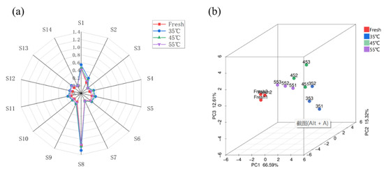 A PCA analysis was performed to investigate the integrated impact of the heating temperature of hot air drying on the volatile compounds of dried Mentha haplocalyx leaves, as demonstrated in Figure 6b. In PCA, the contribution rates of PC1, PC2 and PC3 were 66.59%, 15.32% and 12.61%, respectively. The cumulative variance contribution rate was 94.52% (over 85%), indicating that the PCAwas able to reflect the sensory response information of the volatile compounds in Mentha haplocalyx leaves dried at different temperatures. As shown in the PCA result, the aromatic profiles analyzed by E-nose between the fresh and dried Mentha haplocalyx leaves at 35 °C were quite distinguished. That did not agree with our previous finding of the GC-MS analysis, which is possible because of the different way the samples were prepared. As shown in Figure 6b, even though a closed distribution was observed between hot air-dried samples at 45 °C and 55 °C, there was no clear overlap among the dried samples at the different temperatures, indicating that the profile of volatile aromatic compounds seems unique among the above Mentha haplocalyx leaf samples. This result suggested that the sensory attributes were distinguished by the volatile components that can be analyzed by the E-nose.