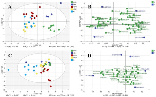 OPLS-DA models based on the flavor compounds of Marselan wine samples from different regions of China. (A) Score scatter plot for Marselan wine samples based on the concentrations of volatile compounds. (B) Loading plot for the volatile compounds of Marselan wine samples. (C) Score plot for Marselan wine samples based on the concentrations of phenolic compounds. (D) Loading plot for the phenolic compounds of Marselan wine samples.