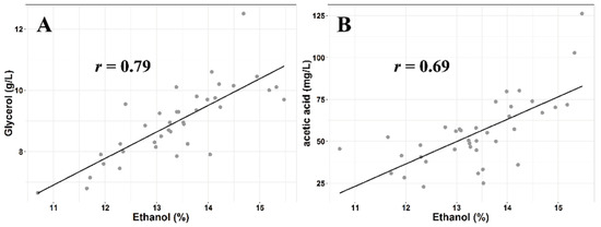 Correlation analysis between ethanol and glycerol (A) and acetic acid (B).