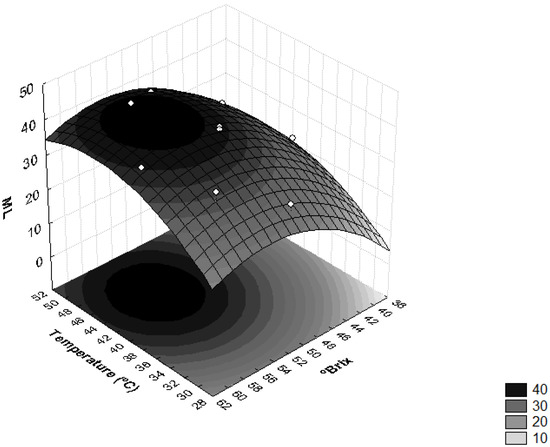 Figure 1 shows the influence of sucrose concentration and temperature on moisture loss. This verified that the interaction between the concentration of the osmotic solution and temperature induced significant effects on the ML levels. Higher moisture losses were obtained when the osmotic solution had concentrations higher than 50 °Brix and the operating temperatures were higher than 40 °C.
