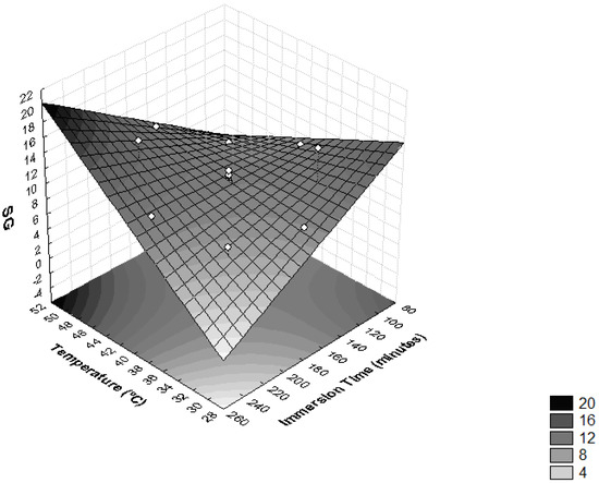 The interactions between temperature and time of immersion on SG is shown in Figure 2 and Table 3. It was observed that these variables had significant influences on SG (p < 0.05). The highest levels of SG were obtained when the operating temperature was higher than 46 °C and immersion time was more than 210 min. Higher SG values were also achieved when temperatures lower than 34 °C were combined with immersion times under 120 min. Similar results were found in the process of the dehydration of apple cylinders using four different osmotic media (50% sucrose, 49.47% sucrose + 0.25% CaCl2, 48.27% sucrose + 0.5% CaCl2 and 40.52% sucrose + 0.50% CaCl2 + 2% NaCl) at temperatures of 20, 40 and 60 °C at 30, 60, 120 and 180 min intervals [35]. During the dehydration of T. Asam, it was also found that the SG was accelerated by the increase in temperature and immersion time, with the maximum SG recorded at a temperature of 55 °C and immersion time of 210 min [27].