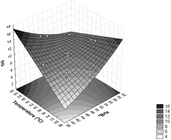 The influence of temperature and concentration of the osmotic solution on SG was also found as significant (p < 0.05) (Figure 3). Higher temperature values (T > 46 °C) and lower solution concentration values (<44 °Brix) provided higher SG, whereas temperatures <34 °C and concentrations of solution of sucrose <44 °Brix resulted in a product with lower SG, thus leaving the final product closer to in natura conditions. The same behavior observed for sapodilla was observed for dehydrated radishes and pumpkins [37], i.e., the temperature and concentration of the osmotic solution influenced SG significantly (p < 0.05).