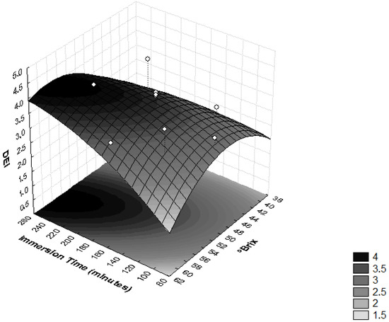 As presented in Figure 5, higher values of DEI were reached with values of temperature >48 °C and immersion times <120 min, and temperatures <40 °C and immersion times >165 min. These effects were observed in assays 7, 5 and 9, where the highest values of DEI were obtained (Table 2). Similar results were seen in the osmotic dehydration process of T. Asam slices, where the optimal process conditions were predicted as a temperature of 38.1 °C, sucrose concentration of 55.6% and osmotic duration of 126.3 min [27].