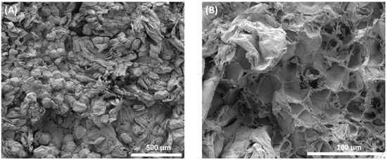 Over the last few years, there have been changes in the field of osmotic processing research and, in addition to the evaluation of macroscopic aspects, it has been sought to observe the process on a microscopic scale, because view of the anatomy and physiology of plant tissue and its cells is useful for understanding mass transfer phenomena [35]. Figure 6A,B shows the cellular structures of sapodilla subjected to the osmotic dehydration process, followed by drying. In Figure 6A, it can be observed that the cells are disordered, there is no uniformity in size due to the wrinkling caused by the loss of water during osmotic dehydration and the turgor of the cells is reduced.