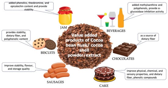 Being a rich source of bioactive compounds, the cocoa husk powder/extract has been tested and used as an additive in various food products for improving the physical, chemical, and biological properties of the products [42]. These bioactive compounds showed remarkable biological activities, which could provide functionality to food products (Figure 2).