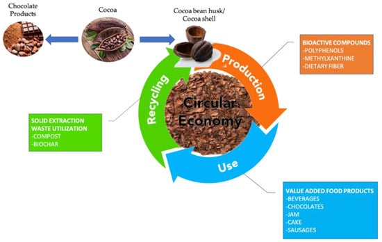 Circular economy concept for cocoa bean husk products. For the circular economy, the cocoa shell husk processed waste products (e.g., residue left after extraction of compounds) could be recycled/reused (e.g., biochar, compost) to provide a complete waste valorization solution with potential sustainable benefits.