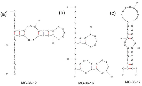 | MG-36-12 | CCATGCGACGGACAGCACGTGTCACCGCGATCAGCC | −5.87 | 169.78 |