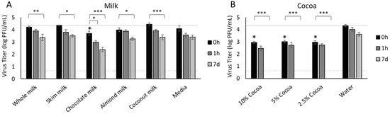 All beverages were purchased from a local vendor, maintaining identical brands for each experiment. Beverage selections were based on popular brands of beverage consumption in the U.S. Dulbecco’s Modified Eagle’s Medium (DMEM) was used as a negative control and is referred to as “media” in the text and figures (Fisher Scientific, Waltham, MA, USA). Beverage samples (1 mL) were transferred into microcentrifuge tubes in duplicate for inoculation. Virus (1 × 104 plaque-forming units, PFU) was transferred into each sample and vortexed briefly. Fifty microliters (50 μL) of each sample were immediately transferred into 450 μL DMEM (Fisher Scientific, Waltham, MA, USA) and vortexed (0 h sample). Two additional 10-fold dilutions were performed immediately, and all three dilutions were promptly transferred into plaque titer plates seeded with Vero E6 cells for plaque assay. One hour later, 50 μL of each sample were transferred into 450 μL of DMEM and 10-fold dilutions and plaque assays were performed for the 1 h time point. Some samples (milks, cocoa, media, and water) were placed into a 4 °C refrigerator for seven days and the same sampling procedure was followed to obtain 7 d samples. Each beverage experiment was repeated three times in duplicate.