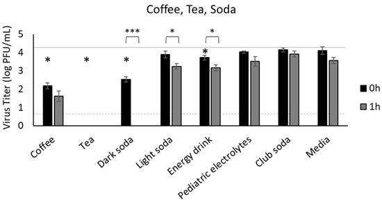 Survival of SARS-CoV-2 in coffee, tea, soda, energy drink, and pediatric electrolyte beverage. SARS-CoV-2 was recovered from beverages immediately after inoculation (0 h) and 1 h later, quantified by plaque assay on Vero E6 cells and shown as log PFU/mL. Infectious virus was significantly reduced at 0 h in coffee, tea, dark soda (p < 0.0001), and energy drink (p < 0.0177). The inoculum is shown as a solid gray line (4.3 log PFU/mL) and the detection limit of the plaque assay is shown as a dashed line (0.7 log PFU/mL). Significant differences between 0 h and inoculum are shown with an asterisk. Significant differences between means at 0 h and 1 h are shown by brackets and asterisks (* <0.05; *** <0.001). Error bars = SEM.