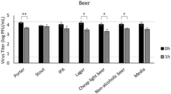 Survival of SARS-CoV-2 in beer. SARS-CoV-2 was recovered from beverages immediately after inoculation (0 h) and 1 h later, quantified by plaque assay on Vero E6 cells, and shown as log PFU/mL. The inoculum is shown as a solid gray line (4.3 log PFU/mL) and the detection limit of the plaque assay is shown as a dashed line (0.7 log PFU/mL). Significant differences between means at 0 h and 1 h are shown by brackets and asterisks (* <0.05; ** <0.01). Error bars = SEM.