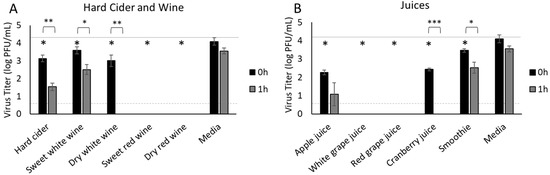 All experiments were performed three times, in duplicate, with freshly purchased and opened beverages each time. Plaque assay data were converted to log PFU/mL prior to statistical analysis. Statistical analyses were conducted in JMP (SAS Institute, Cary, NC, USA), using analysis of variance (ANOVA) followed by Dunnett’s post hoc test for comparison of 0 h and inoculum, Tukey’s HSD for comparison of beverages with 0 h, 1 h, and 7 d time points, and paired t-test for comparison of beverages with 0 h and 1 h time points. Significant differences were detected at p < 0.05. Error bars = SEM. Correlations were analyzed using bivariate analysis in JMP.