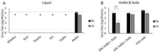 Since we found minimal detrimental effects of alcohol content on infectious virus from beer with up to 6.9% alcohol content, and the detrimental effects of hard cider (5% alcohol) and wine (10–14.7% alcohol) appear to be attributable to inherent effects of the fruit juices from which they are produced rather than the alcohol, we also assessed hard liquors. We included whiskey, rum, tequila, gin, and vodka, selecting brands that all contained 40% alcohol. As expected, no infectious virus was recovered from any of these beverages (Figure 5A), demonstrating that a critical threshold of alcohol content had been reached at 40% alcohol. Considering that many people do not drink liquor straight, we also tested simulated cocktails, which would have a lower alcohol percentage when the liquor is mixed with a non-alcoholic beverage. To avoid confounding effects of juices or sodas, we mixed vodka with club soda, which had no significant antiviral effect up to 1 h (Figure 2 and shown in Figure 5B for comparison), to achieve simulated cocktails with 20% (1:1 mixture vodka and club soda) and 10% (1:2 mixture) alcohol content. Although vodka and soda with 20% alcohol significantly reduced infectious virus by 1 h post-inoculation (p = 0.037), no significant reduction was observed for the mixed drink with 10% alcohol over the same time period (p > 0.05, Figure 5B).
